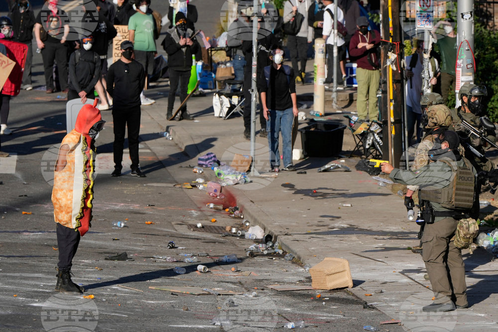 FILE - A law enforcement officer points a taser at a person wearing a hot dog costume during a protest Saturday, June 14, 2025, in Portland, Ore. (AP Photo/Jenny Kane, File)