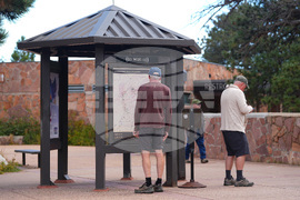 Visitors take in the view outside the locked Trail Ridge Road visitors center in Rocky Mountain National Park, which is closed because of the shutdown of the federal government Wednesday, Oct. 1,2025, in Estes Park, Colo. (AP Photo/David Zalubowski)