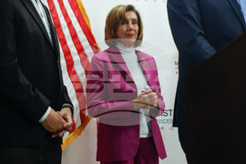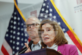 Speaker Emerita Nancy Pelosi, center, listens as Congressman Kevin Mullin, right, speaks at a press conference at North East Medical Services on Thursday, Oct. 2, 2025, in San Francisco. (Lea Suzuki/San Francisco Chronicle via AP)