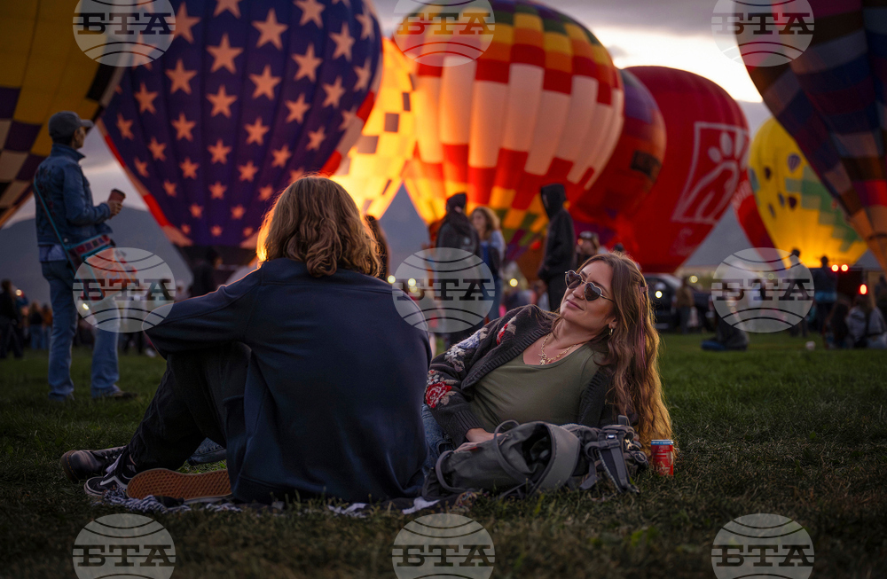 Luke Bruce and Shelly Ortiz, of Denver watch balloons inflate during the opening day of the Albuquerque International Balloon Fiesta at Balloon Fiesta Park in Albuquerque, N.M., on Saturday, Oct. 4, 2025. (Chancey Bush/The Albuquerque Journal via AP)