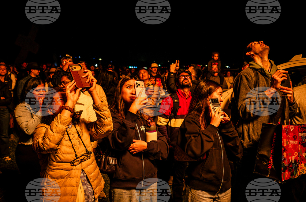 People watch as the Dawn Patrol balloons light up the dark sky during the opening day of the Albuquerque International Balloon Fiesta at Balloon Fiesta Park in Albuquerque, N.M., on Saturday, Oct. 4, 2025. (Chancey Bush/The Albuquerque Journal via AP)