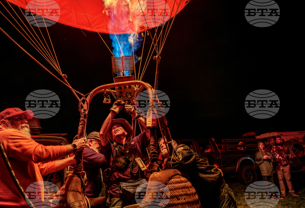 Pilot Ron Thornton with the Dawn Patrol team releases flames into his balloon named Peanuts 4Ever during opening day of the Albuquerque International Balloon Fiesta at Balloon Fiesta Park in Albuquerque, N.M., on Saturday, Oct. 4, 2025. (Chancey Bush/The Albuquerque Journal via AP)