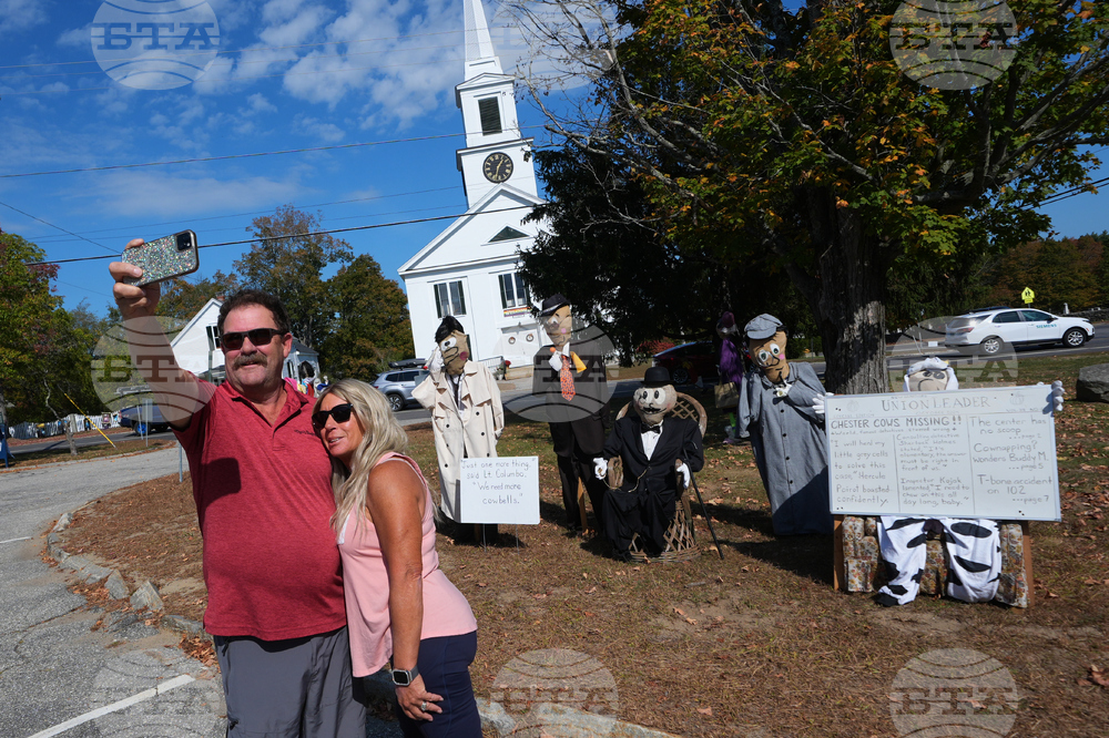 Bob and Cheryl Belanger, of Wells, Maine, take a selfie with some of the hundreds of scarecrows on display in the town commons Saturday, Oct. 4, 2025, in Chester, N.H. (AP Photo/Charles Krupa)