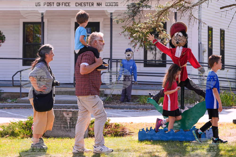 A family walks past some of the hundreds of scarecrows on display in the town commons on Saturday, Oct. 4, 2025, in Chester, N.H. (AP Photo/Charles Krupa)