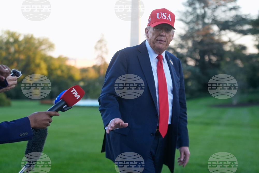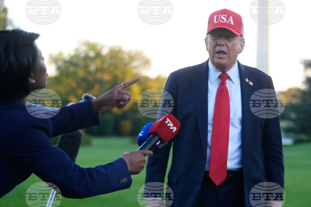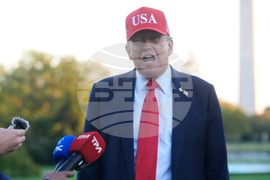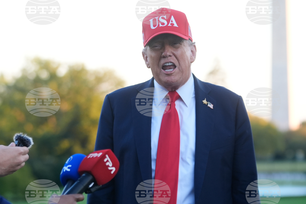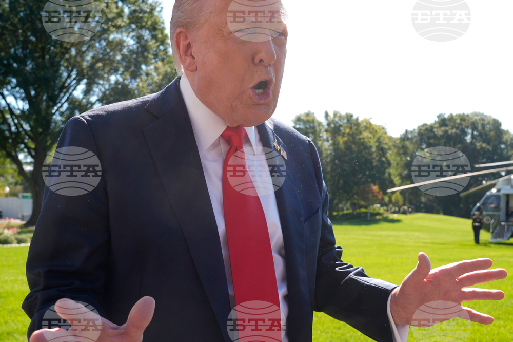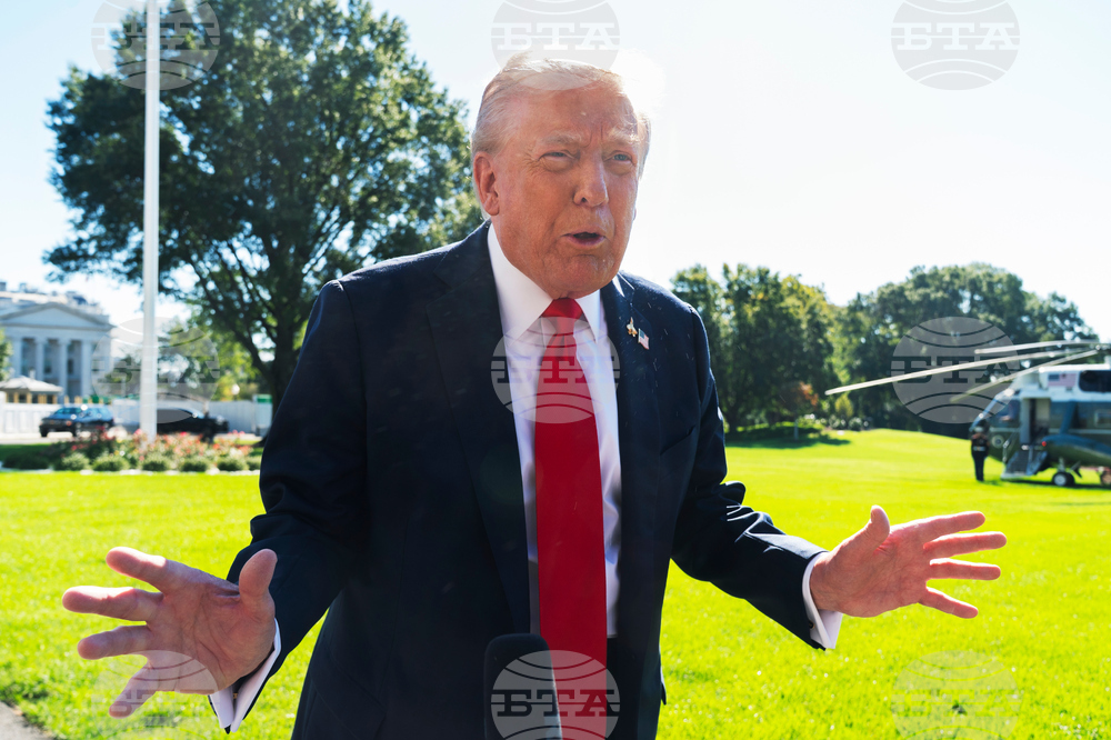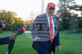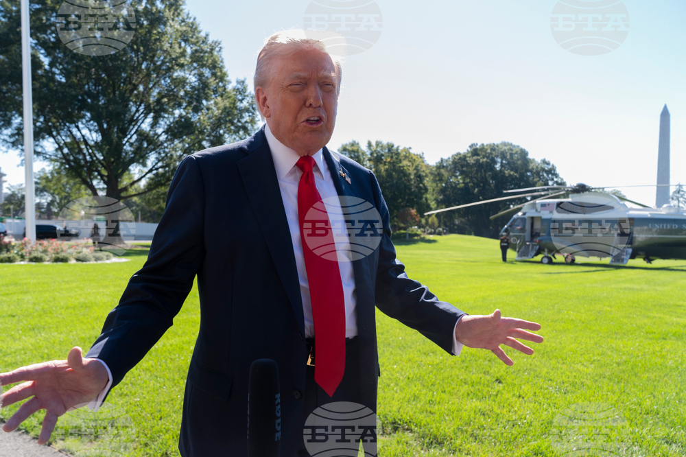 President Donald Trump speaks to reporters before departing the White House, en route Norfolk, Va., to observe a naval sea power demonstration, Sunday, Oct. 5, 2025, in Washington. (AP Photo/Manuel Balce Ceneta)