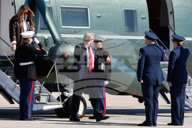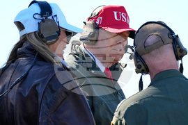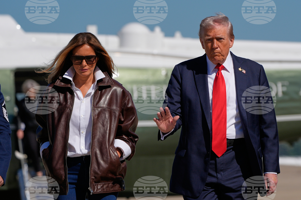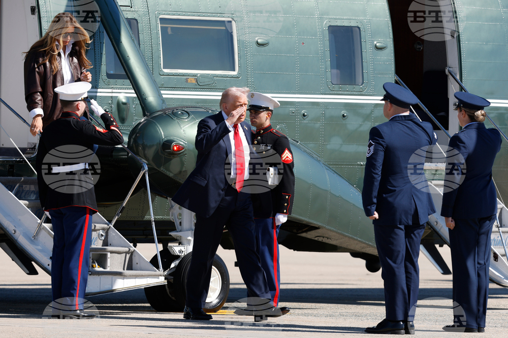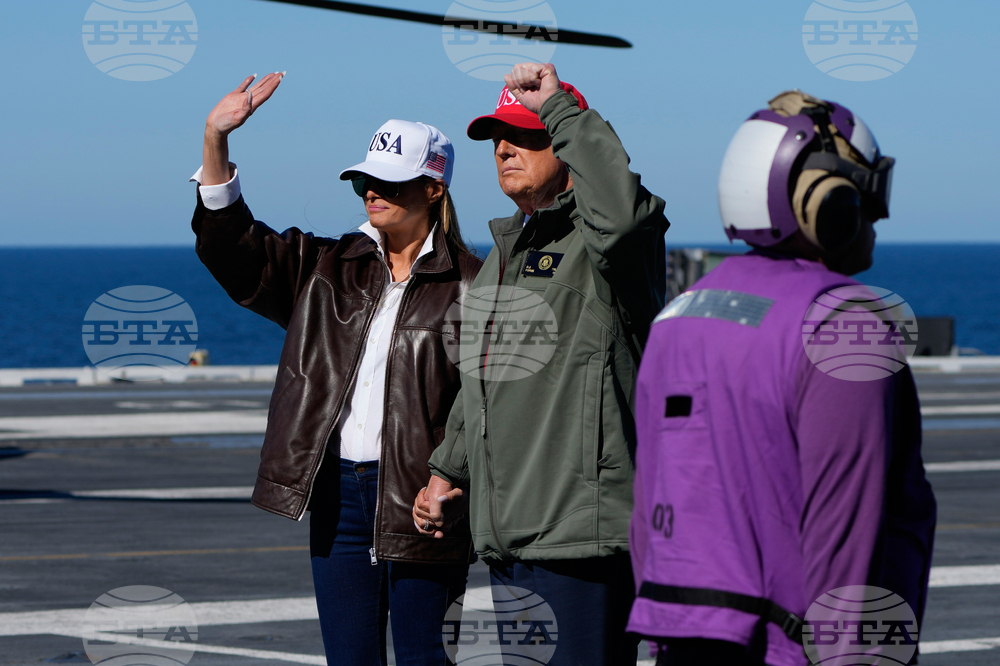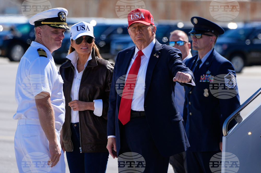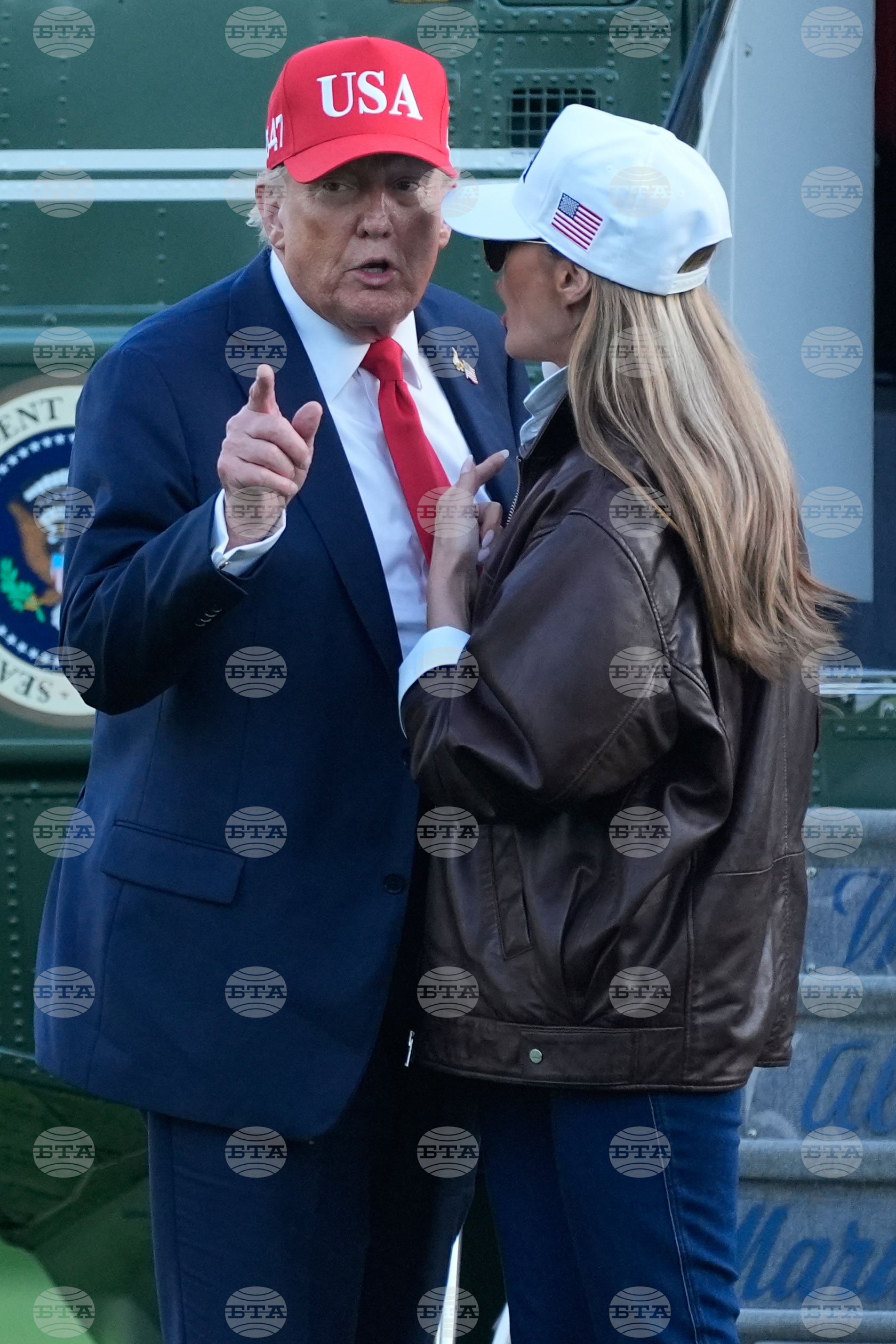 President Donald Trump and first lady Melania Trump arrive on Marine One to watch a naval sea power demonstration, part of the Navy's 250th anniversary celebration, aboard the USS George H.W. Bush aircraft carrier in the Atlantic Ocean off the coast of Norfolk, Va., Sunday, Oct. 5, 2025. (AP Photo/Alex Brandon)