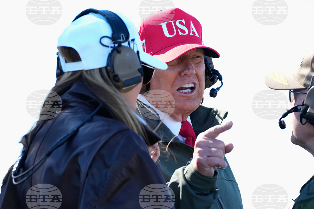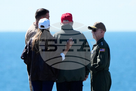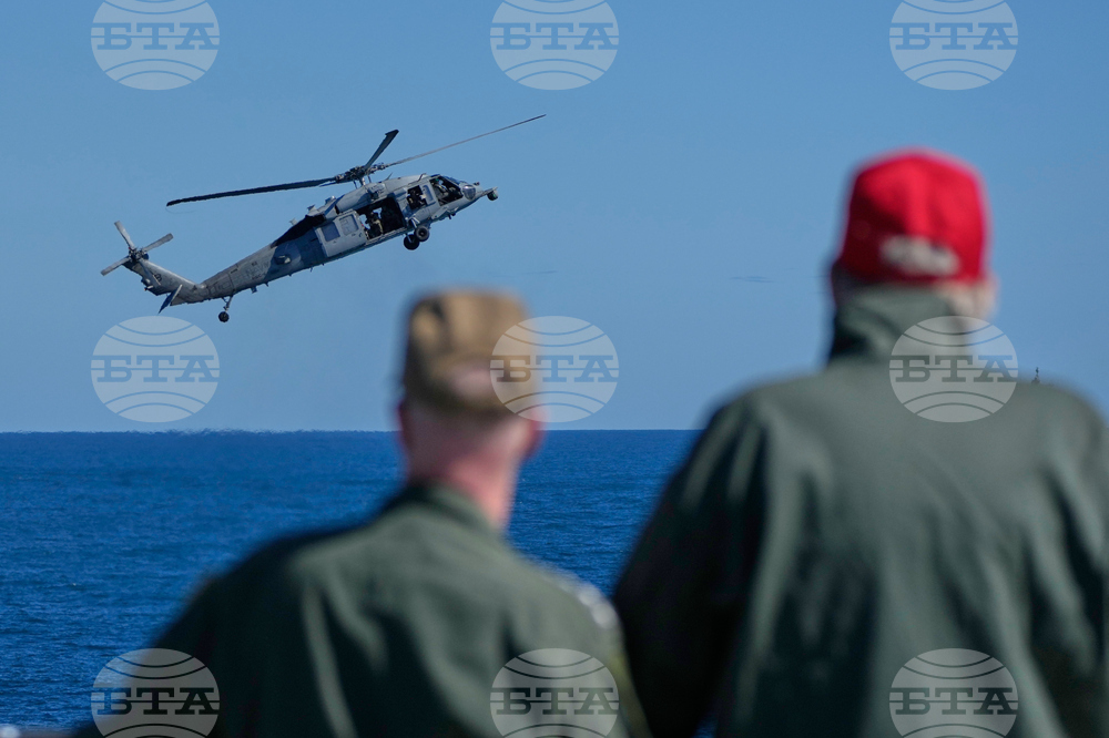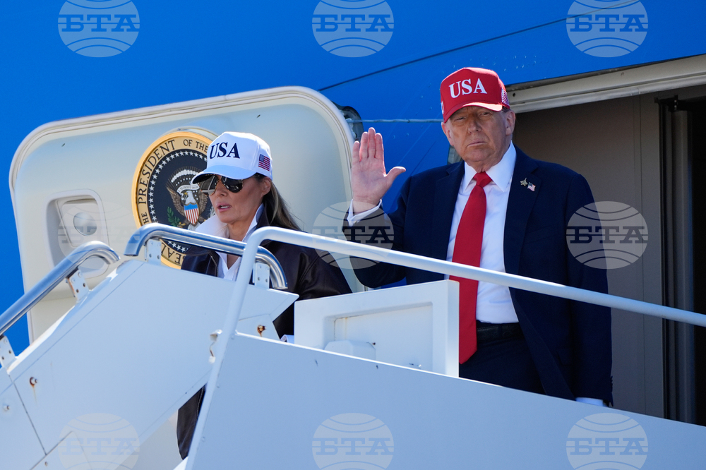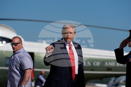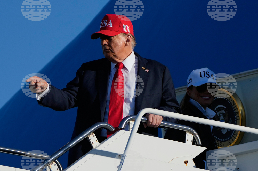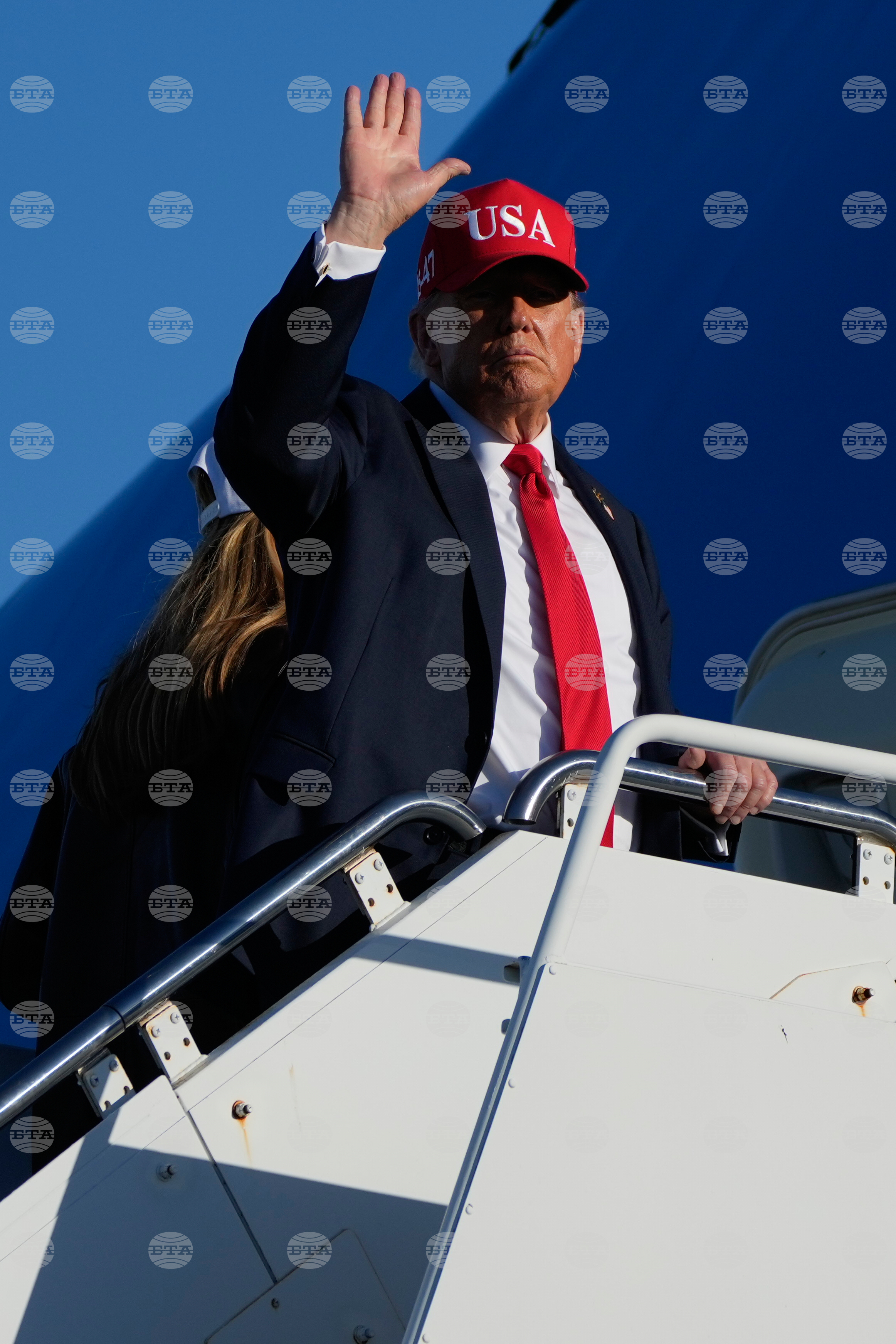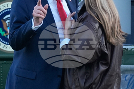 President Donald Trump and first lady Melania Trump arrive on Marine One to watch a naval sea power demonstration, part of the Navy's 250th anniversary celebration, aboard the USS George H.W. Bush aircraft carrier in the Atlantic Ocean off the coast of Norfolk, Va., Sunday, Oct. 5, 2025. (AP Photo/Alex Brandon)