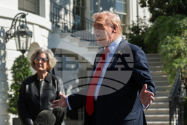 President Donald Trump speaks to reporters before departing the White House, en route Norfolk, Va., to observe a naval sea power demonstration, Sunday, Oct. 5, 2025, in Washington, as White House chief of staff Susie Wiles listens. (AP Photo/Manuel Balce Ceneta)