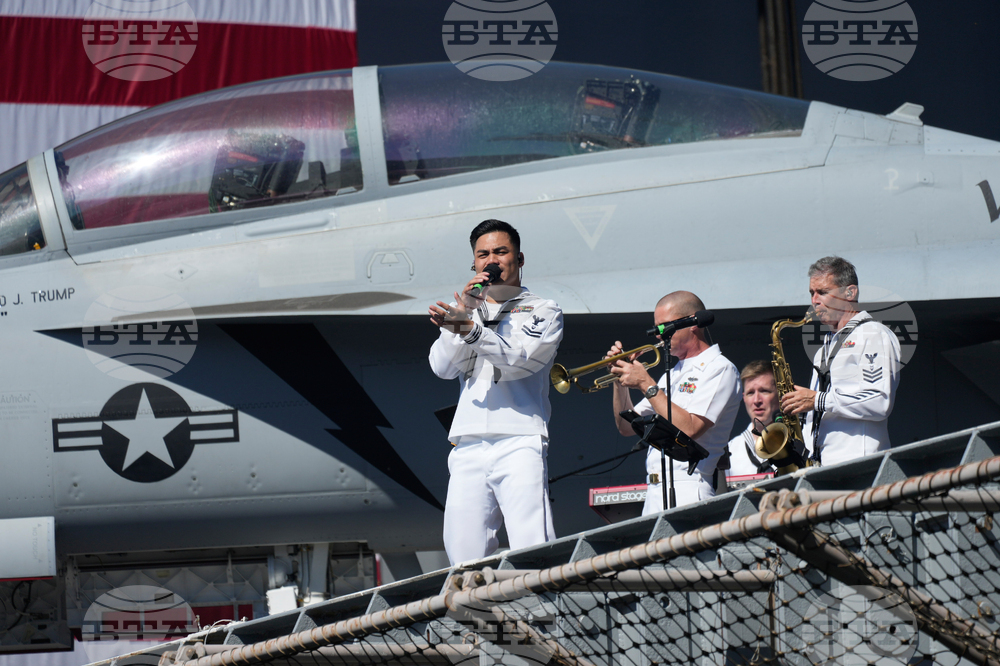 A Navy band performs before President Donald Trump arrives to speak during a celebration for the 250th anniversary of the U.S. Navy aboard the USS Harry S. Truman at Naval Station Norfolk, Sunday Oct. 5, 2025 in Norfolk, Va. (AP Photo/Steve Helber)