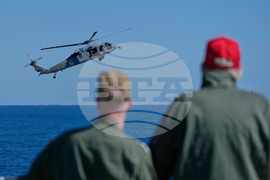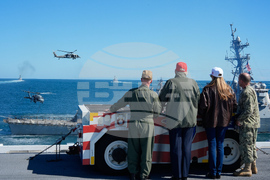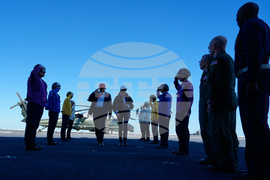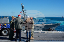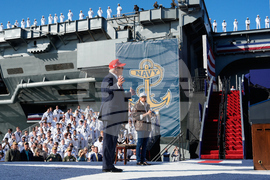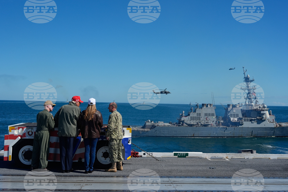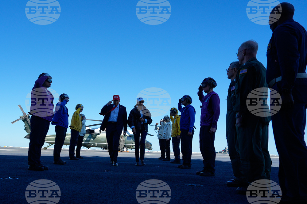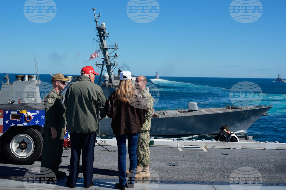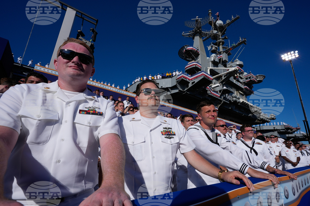 Sailors watch as President Donald Trump and first lady Melania Trump observe a naval sea power demonstration, part of the Navy's 250th anniversary celebration, aboard the USS George H.W. Bush aircraft carrier in the Atlantic Ocean off the coast of Norfolk, Va., Sunday, Oct. 5, 2025. (AP Photo/Alex Brandon)