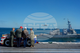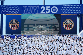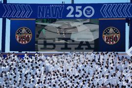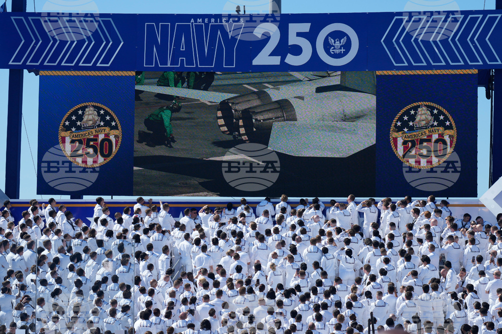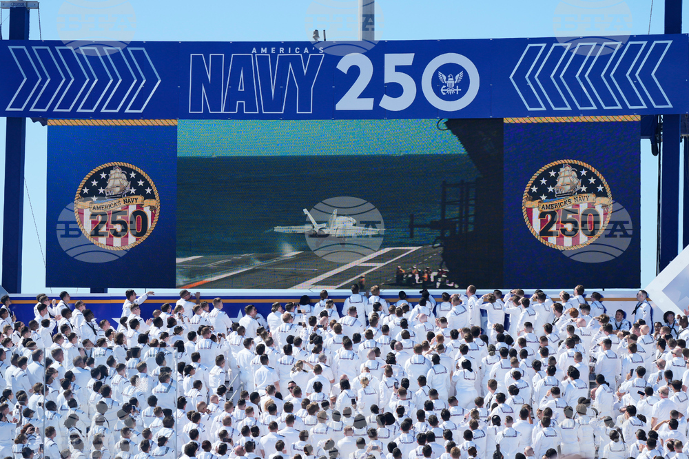 Sailors watch a video board as during a sea power demonstration from the USS George H.W. Bush before President Donald Trump speaks during a celebration for the 250th anniversary of the U.S. Navy aboard the USS Harry S. Truman at Naval Station Norfolk, Sunday Oct. 5, 2025 in Norfolk, Va. (AP Photo/Steve Helber)
