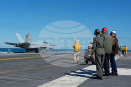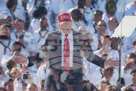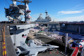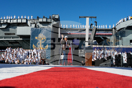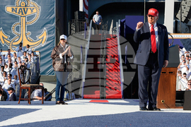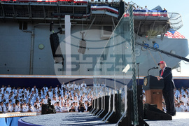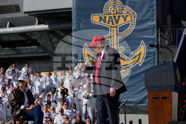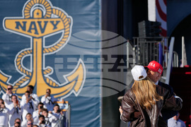 People arrive before President Donald Trump speaks during a celebration for the 250th anniversary of the U.S. Navy aboard the USS Harry S. Truman at Naval Station Norfolk, Sunday Oct. 5, 2025 in Norfolk, Va. (AP Photo/Alex Brandon)