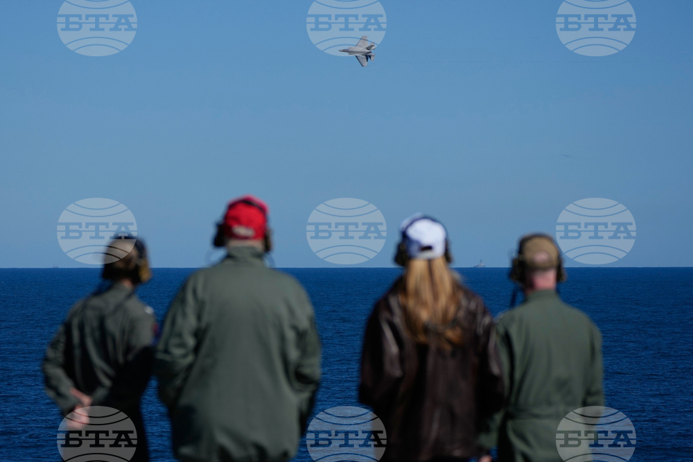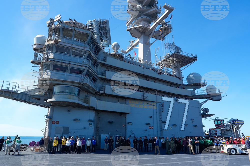 The presidential flag flies on the USS George H.W. Bush as President Donald Trump and first lady Melania Trump attend a naval sea power demonstration, part of the Navy's 250th anniversary celebration, aboard the USS George H.W. Bush aircraft carrier in the Atlantic Ocean off the coast of Norfolk, Va., Sunday, Oct. 5, 2025. (AP Photo/Alex Brandon)