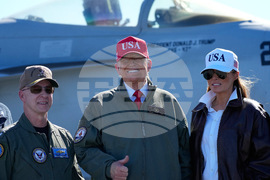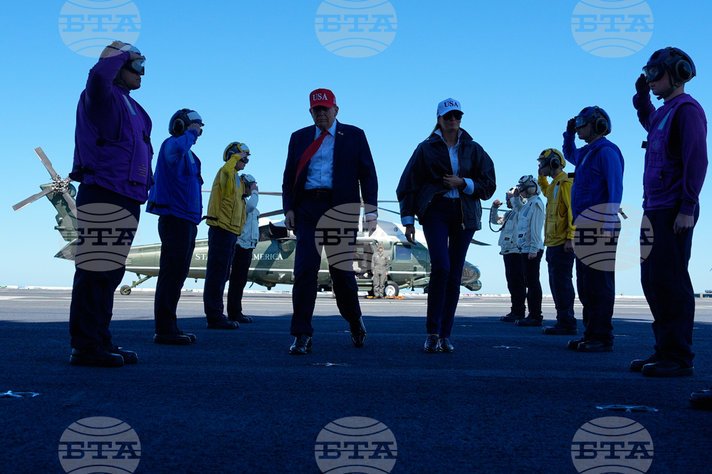 President Donald Trump and first lady Melania Trump pose on the flight deck after watching a naval sea power demonstration, part of the Navy's 250th anniversary celebration, aboard the USS George H.W. Bush aircraft carrier in the Atlantic Ocean off the coast of Norfolk, Va., Sunday, Oct. 5, 2025. (AP Photo/Alex Brandon)