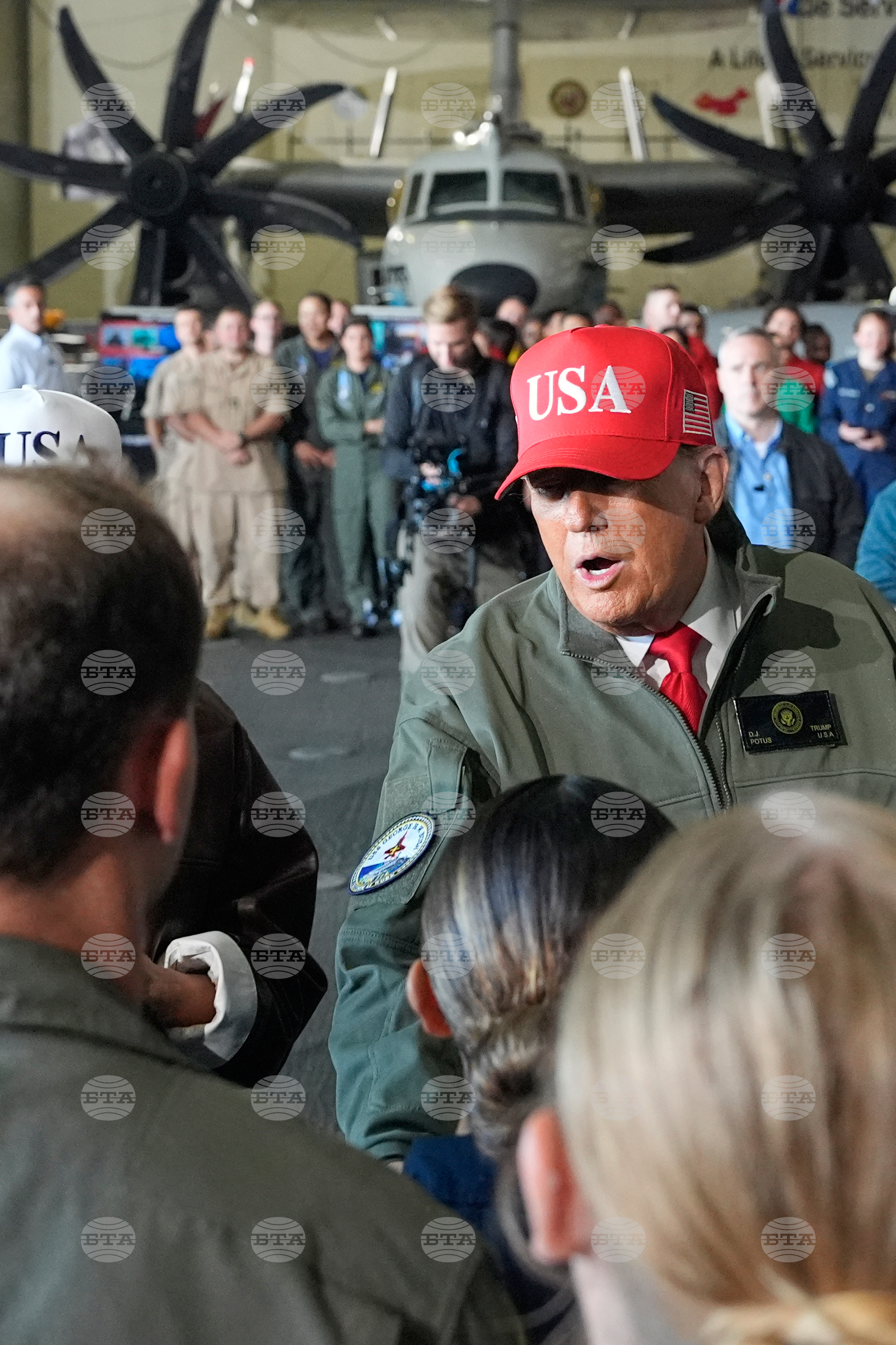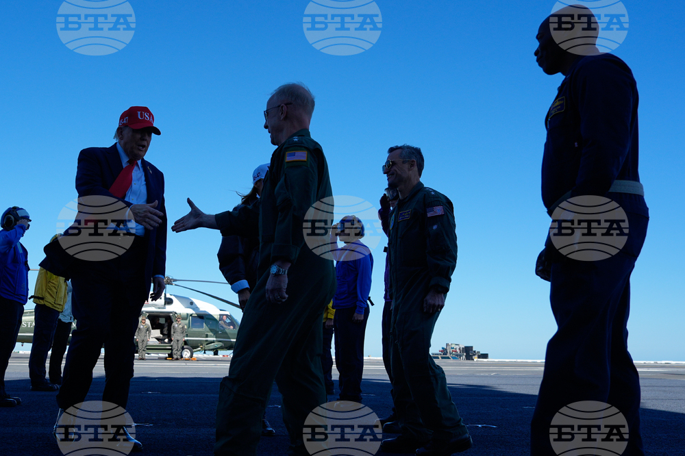 President Donald Trump greets sailors as part of the Navy's 250th anniversary celebration, aboard the USS George H.W. Bush aircraft carrier in the Atlantic Ocean off the coast of Norfolk, Va., Sunday, Oct. 5, 2025. (AP Photo/Alex Brandon)
