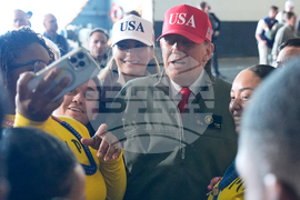 President Donald Trump, center, is greeted by Air Force 89th Air Wing Deputy Commander Melissa Dombrock, right, as first lady Melania Trump, top left, exit Marine One before boarding Air Force One, Sunday, Oct. 5, 2025, at Joint Base Andrews, Md. (AP Photo/Luis M. Alvarez)