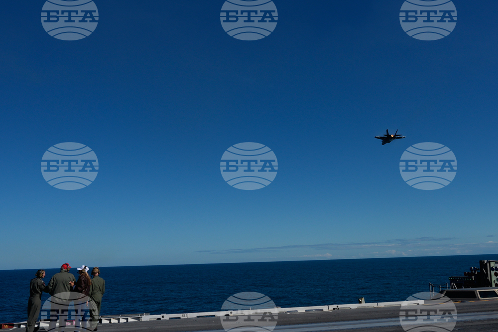 A F35C fighter jet does a high speed pass as President Donald Trump and first lady Melania Trump watch a naval sea power demonstration, part of the Navy's 250th anniversary celebration, aboard the USS George H.W. Bush aircraft carrier in the Atlantic Ocean off the coast of Norfolk, Va., Sunday, Oct. 5, 2025. (AP Photo/Alex Brandon)