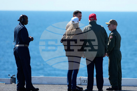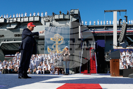 President Donald Trump watches a naval sea power demonstration, part of the Navy's 250th anniversary celebration, aboard the USS George H.W. Bush aircraft carrier in the Atlantic Ocean off the coast of Norfolk, Va., Sunday, Oct. 5, 2025. (AP Photo/Alex Brandon)