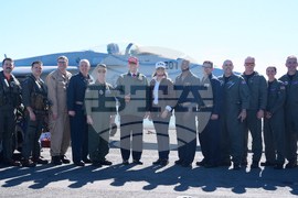 President Donald Trump and first lady Melania Trump pose with Chief of Naval Operations Adm. Daryl Caudle, left, in front of a F/A-18E fighter jet with President Donald Trump's name on it, as part of the Navy's 250th anniversary celebration, aboard the USS George H.W. Bush aircraft carrier in the Atlantic Ocean off the coast of Norfolk, Va., Sunday, Oct. 5, 2025. (AP Photo/Alex Brandon)