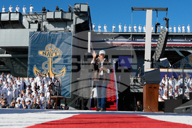 First lady Melania Trump speaks before President Donald Trump during a celebration for the 250th anniversary of the U.S. Navy aboard the USS Harry S. Truman at Naval Station Norfolk, Sunday Oct. 5, 2025 in Norfolk, Va. (AP Photo/Alex Brandon)