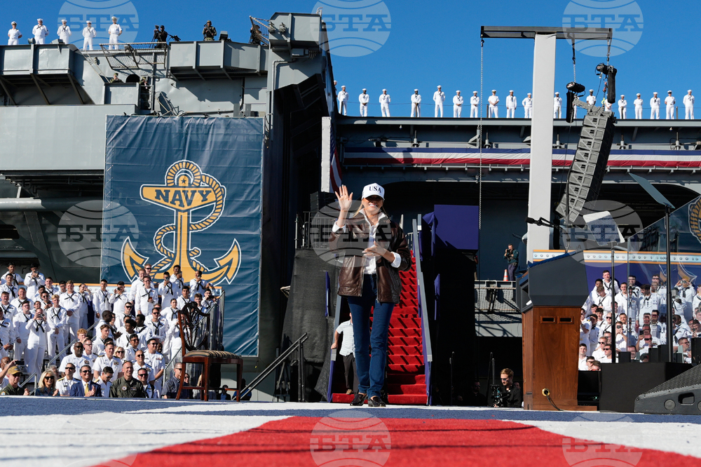 First lady Melania Trump arrives to introduce President Donald Trump during a celebration for the 250th anniversary of the U.S. Navy aboard the USS Harry S. Truman at Naval Station Norfolk, Sunday Oct. 5, 2025 in Norfolk, Va. (AP Photo/Steve Helber)