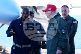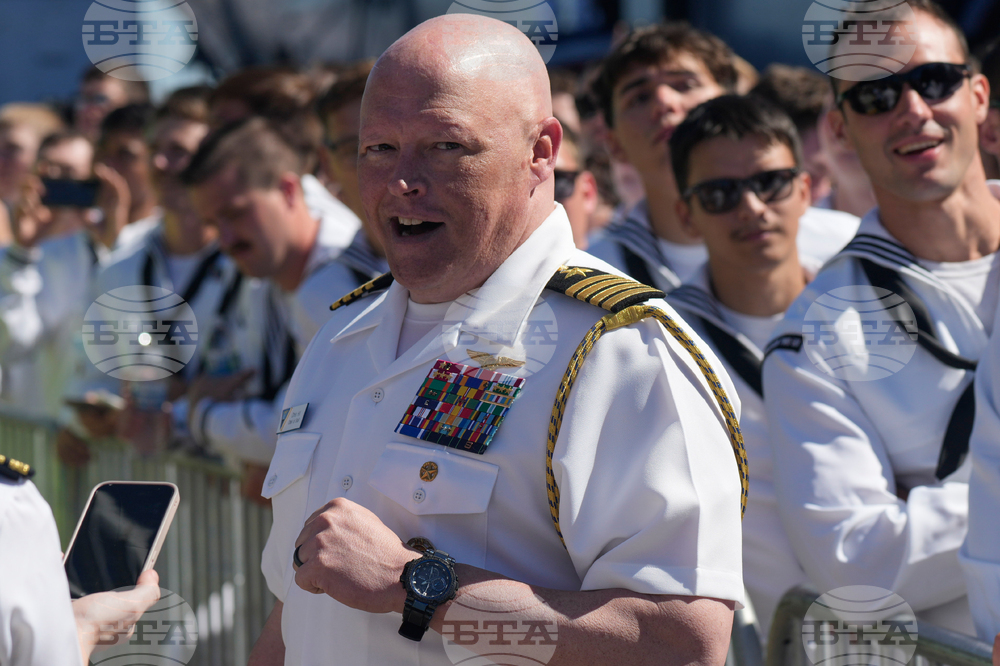 Capt. Chris Hill, Chief of Staff for Naval Air Force Atlantic, arrives before President Donald Trump arrives during a celebration for the 250th anniversary of the U.S. Navy aboard the USS Harry S. Truman at Naval Station Norfolk, Sunday Oct. 5, 2025 in Norfolk, Va. (AP Photo/Steve Helber)