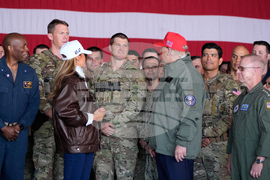 President Donald Trump greets first lady Melania Trump as he arrives to speak during a celebration for the 250th anniversary of the U.S. Navy aboard the USS Harry S. Truman at Naval Station Norfolk, Sunday Oct. 5, 2025 in Norfolk, Va. (AP Photo/Steve Helber)
