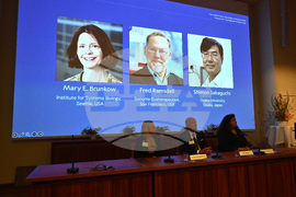 A screen showing the photos of Mary E Brunkow, Fred Ramsdell and Shimon Sakaguchi who were awarded the Nobel Prize in Medicine or Physiology, at the Nobel Assembly of the Karolinska Institutet, in Stockholm, Sweden, Monday, Oct. 6, 2025. (Claudio Bresciani/TT News Agency via AP)