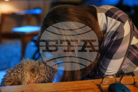 Seeing through the window, Mary E. Brunkow is seen answering messages and emails after winning a Nobel Prize in medicine for part of her work on peripheral immune tolerance, in Seattle, Monday, Oct. 6, 2025. Next to her is her dog Zelda. (AP Photo/Lindsey Wasson)