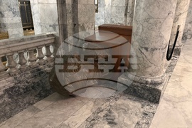 In this undated photo provided by the Department of Enterprise Services, a Washington state government agency, county flags sit burned on marble steps inside the capitol in Olympia, Wash., after an intruder broke in and vandalized the Legislative building on the evening of Oct. 5, 2025. (Department of Enterprise Services via AP)