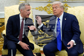 FILE - Canada's Prime Minister Mark Carney talks with President Donald Trump before a group photo at the G7 Summit, June 16, 2025, in Kananaskis, Canada. (AP Photo/Mark Schiefelbein, File)
