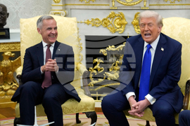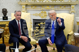 Canada Prime Minister Mark Carney and President Donald Trump hold a press conference at the White House in Washington, D.C., Tuesday, Oct. 7, 2025. (Adrian Wyld/The Canadian Press via AP)