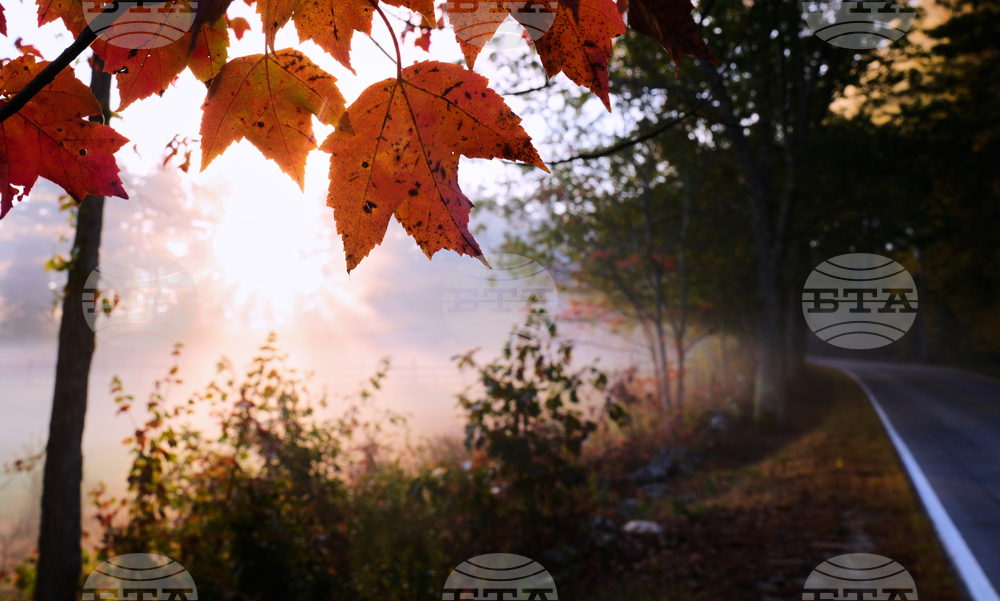 Maple leaves turn to fall foliage colors at sunrise along a country road, Tuesday, Oct. 7, 2025, in Auburn, N.H. (AP Photo/Charles Krupa)