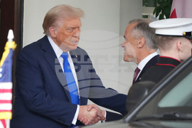 President Donald Trump waits to greet Canada's Prime Minister Mark Carney, as Carney arrives at the White House, Tuesday, Oct. 7, 2025, in Washington. (AP Photo/Jacquelyn Martin)
