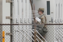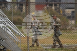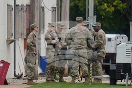 Military personnel in uniform, with the Texas National Guard patch on, are seen at the U.S. Army Reserve Center, Tuesday, Oct. 7, 2025, in Elwood, Ill., a suburb of Chicago. (AP Photo Erin Hooley)