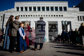 Walton Kelley, 8, from Murray, left, and others wait in line to enter The Church of Jesus Christ of Latter-day Saints' Conference Center for President Russell M. Nelson's funeral in Salt Lake City on Oct. 7, 2025. (Tess Crowley/The Deseret News via AP)