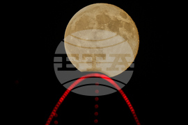 The Harvest Supermoon rises beyond a wheel ride, Tuesday, Oct. 7, 2025, in Kansas City, Mo. (AP Photo/Charlie Riedel)