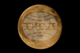 Birds are silhouetted against the rising Harvest Supermoon, Tuesday, Oct. 7, 2025, in Kansas City, Mo. (AP Photo/Charlie Riedel)