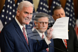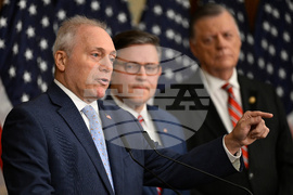 House Majority Leader Steve Scalise, R-La., left, addresses the media as Speaker of the House Mike Johnson, R-La., and House Committee on Appropriations Chairman Tom Cole, R-Okla., listen during a press conference on 8th day of the government shutdown at the U.S. Capitol on Wednesday, Oct. 8, 2025, in Washington. (AP Photo/John McDonnell)