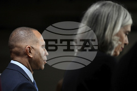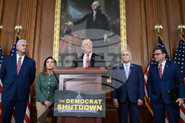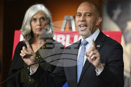 House Minority Leader Hakeem Jeffries, D-N.Y., left, and Minority Whip Katherine Clark, D-Mass., listen to House Democratic leaders during a news conference on the 8th day of a government shutdown at the U.S. Capitol on Wednesday, Oct. 8, 2025, in Washington. (AP Photo/John McDonnell)