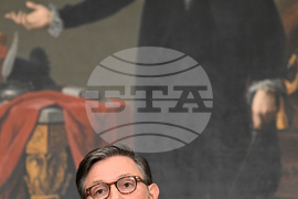 Speaker of the House Mike Johnson, R-La., speaks at a press conference on the 8th day of the government shutdown at the U.S. Capitol on Wednesday, Oct. 8, 2025, in Washington. (AP Photo/John McDonnell)