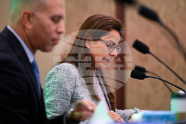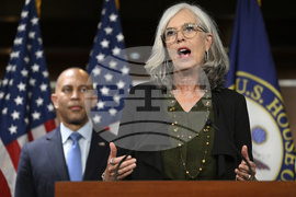 House Minority Whip Katherine Clark, D-Mass., listens to House Minority Leader Hakeem Jeffries, D-N.Y., speak at a news conference on the 8th day of a government shutdown at the U.S. Capitol on Wednesday, Oct. 8, 2025, in Washington. (AP Photo/John McDonnell)