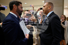House Minority Leader Hakeem Jeffries, D-N.Y., speaks during a news conference on the 8th day of government shutdown at the U.S. Capitol on Wednesday, Oct. 8, 2025, in Washington. (AP Photo/John McDonnell)