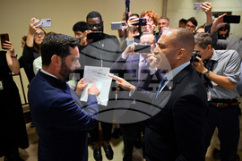 Rep. Michael Lawler, R-N.Y., left, confronts House Minority Leader Hakeem Jeffries, D-N.Y., in a heated discussion to endorse House bill H.R.5145 that would extend the American Rescue Plan Act of 2021 (ARPA) and the Inflation Reduction Act of 2022 at the U.S. Capitol on Wednesday, Oct. 8, 2025, in Washington. (AP Photo/John McDonnell)