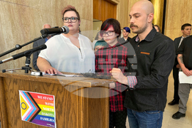 FILE - Parents Devon and Robert Dolney, stand with their child, Tate, center, during a news conference, Sept. 14, 2023, at the state Capitol in Bismarck, N.D. (AP Photo/Jack Dura, File)