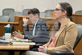 FILE - Plaintiff attorneys Jess Braverman, left, and Brittany Stewart appear in court, Jan. 27, 2025, at the Burleigh County Courthouse in Bismarck, N.D., during the trial related to the state's ban on gender-affirming medical care for kids. (AP Photo/Jack Dura, File)
