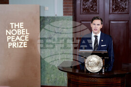 Chairman of the Nobel Committee, Jørgen Watne Frydnes, announces that Venezuelan opposition leader María Corina Machado is the laureate of the Nobel Peace Prize for 2025 in Oslo, Friday, Oct. 10, 2025. (Rodrigo Freitas/NTB Scanpix via AP)