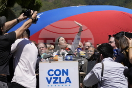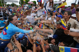 FILE - Presidential candidate Edmundo Gonzalez, center left, and opposition leader Maria Corina Machado, center right, greet supporters during a campaign rally in Maracaibo, Venezuela, Tuesday, July 23, 2024. (AP Photo/Matias Delacroix, File)