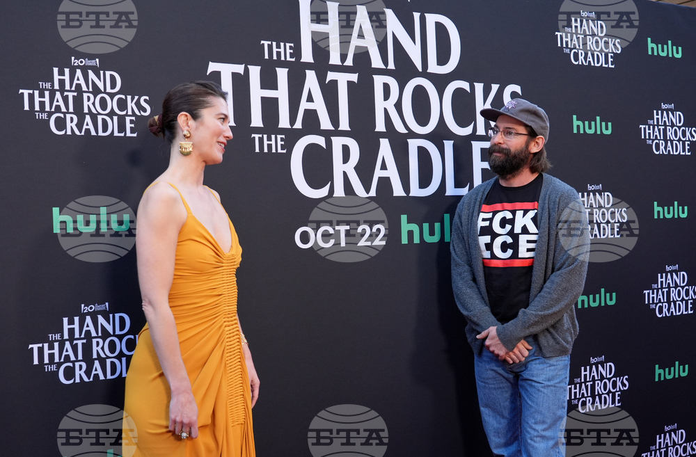 Mary Elizabeth Winstead, left, a cast member in "The Hand That Rocks the Cradle," greets fellow cast member Martin Starr at the premiere of the film on Wednesday, Oct. 15, 2025, at The Walt Disney Studios in Burbank, Calif. (AP Photo/Chris Pizzello)