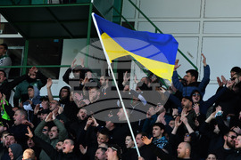Стара Загора (26 февруари 2022) Футболна среща от Първа лига между отборите на Берое и Ботев Пловдив. На снимката: привърженици на Берое развяха знамето на Украйна. Пресфото-БТА снимка: Атанас Жеков (ПК)
